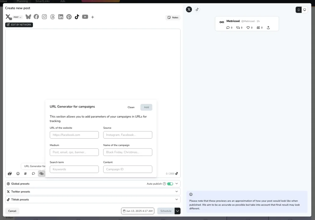 If you’re using Metricool to plan your posts, you’ll see these fields right in the post editor when you click the UTM button, making it easy to add them without missing a step.